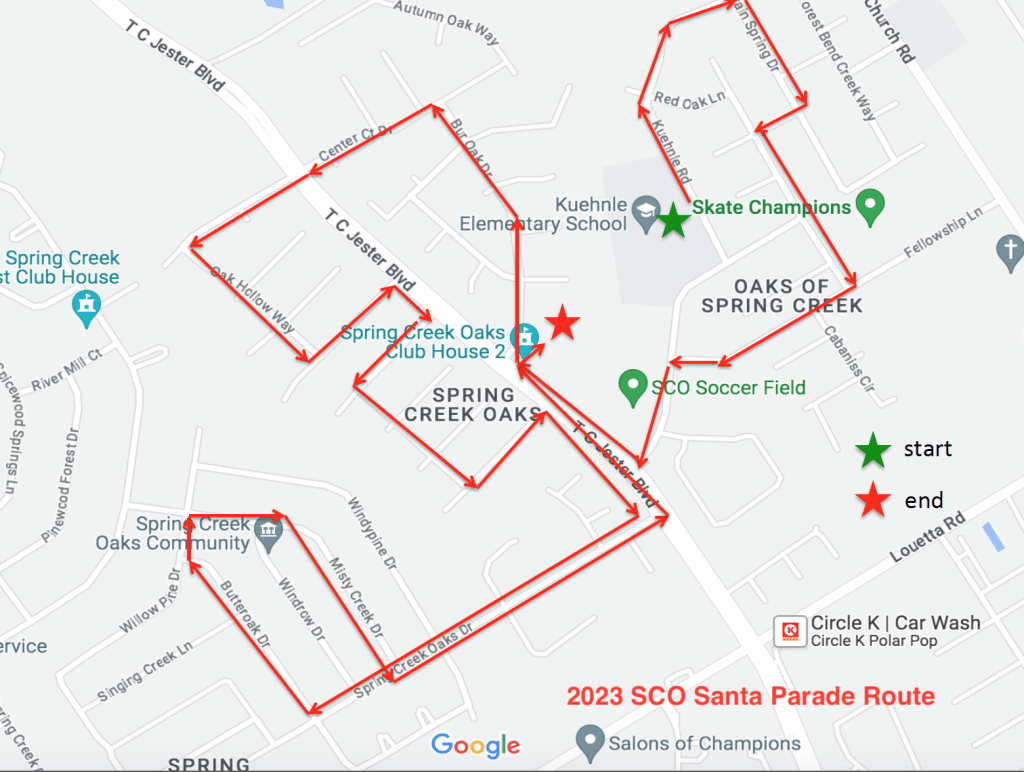 Please Save-the-Date for Saturday, December 9th for our Annual SCO Santa Parade and Breakfast with Santa. The parade will begin around 9am (see route below) and Breakfast with Santa will be held at Clubhouse 2 (6002 Bur Oak) from 10a-12p. This year’s Breakfast with Santa will feature holiday crafts, donuts, a hot cocoa bar, photos with Santa, a bounce house, train rides, and more! We look forward to seeing you at the event!